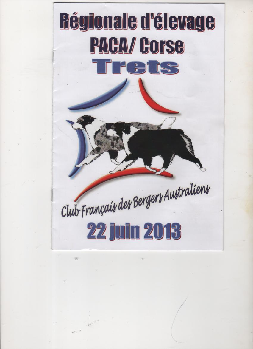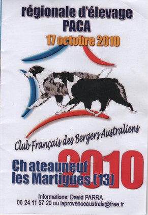 Le 20.09.2010 Exposition régionale d' élevage Berger Australiens Un très bonne journée pour nos toutous à la régionale d' élevage, organisée par Mme. Caroline LAYROLLES à Ville sur Anjou ( 38 ). Jury pressenti: M. LALANE DE JONQUEL Philippe et M. CALENDRIN Gérard - BEST IN SHOW du Domaine de la Camosciara - 2e EXCELLENT - CLASSE CHAMPION - BAYMIE BLUE de l' Orée des Charmois - EXCELLENT N.C. - C.O.F. et pour leurs première sortie, nos petits derniers: - ELECTRA BLUE EYES du SARMIZEGETUSA REGIA - 1ère TRES PROMEiTEUR - MEILLEURE PUPPY - EAGLE EYE du SARMIZEGETUSA REGIA - 2e TRES PROMETTEUR Un GRAND merci à Céline, pour la présentation de Best in Show !